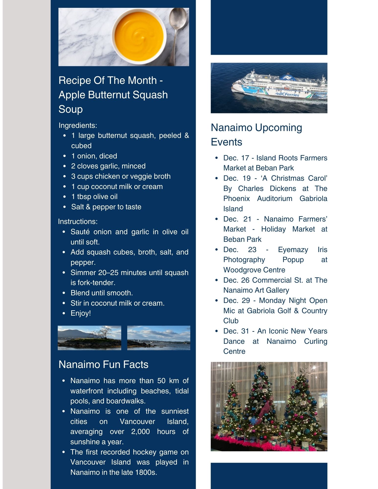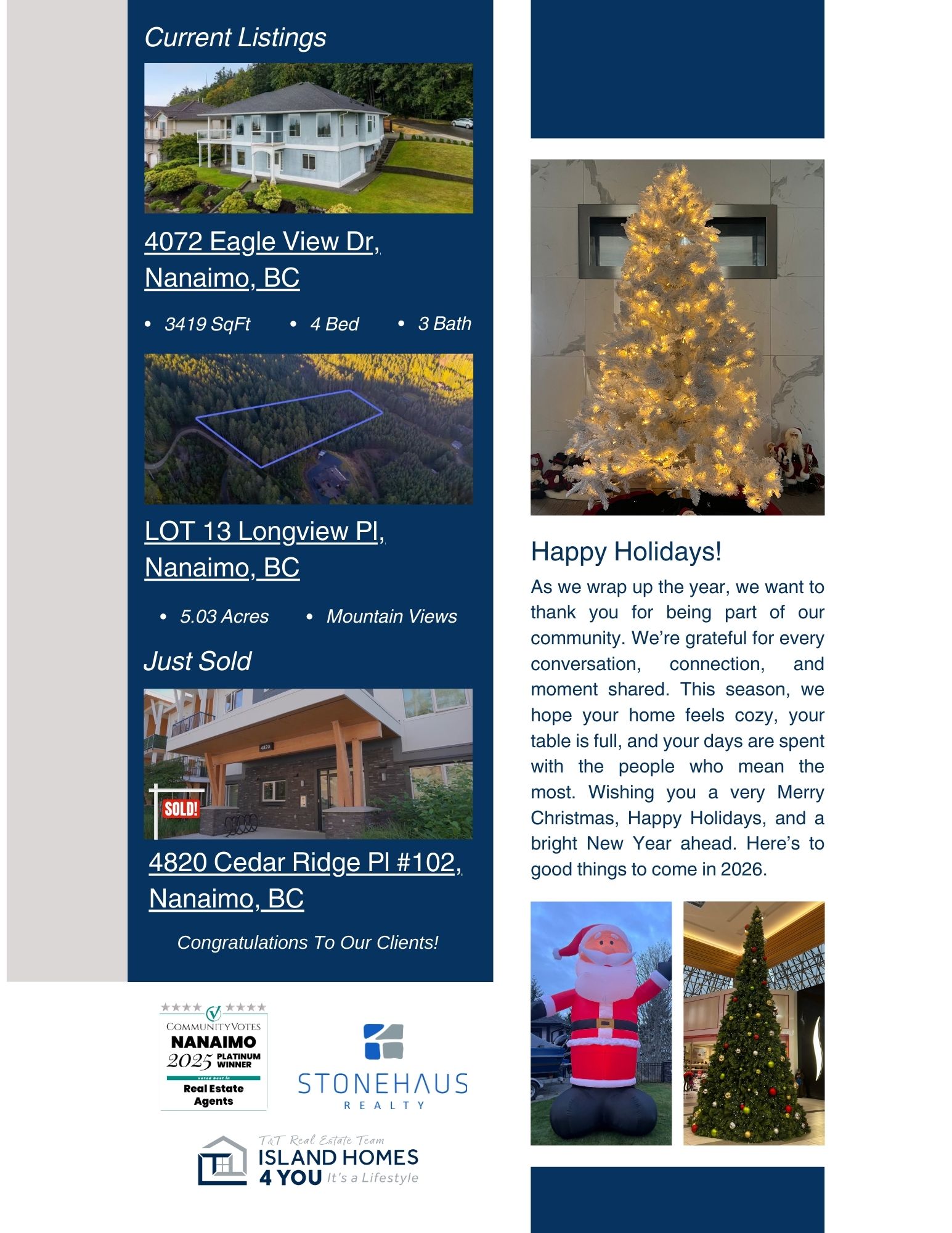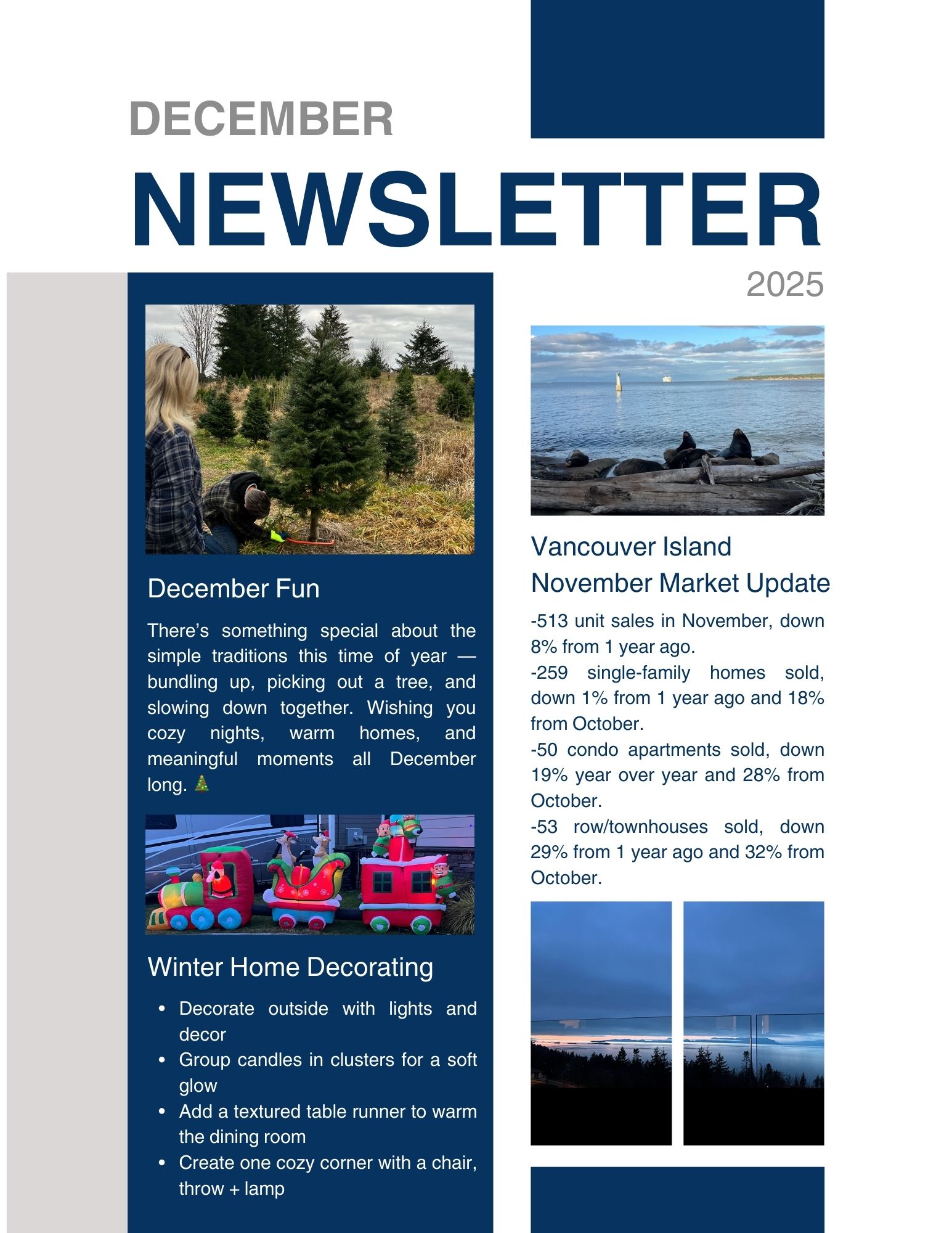 As we wrap up another year here on beautiful Vancouver Island, December is a time to slow down, reflect, and look ahead. Our December 2025 Newsletter brings together a snapshot of the local real estate market, community happenings around Nanaimo, and a little seasonal inspiration to enjoy at home.