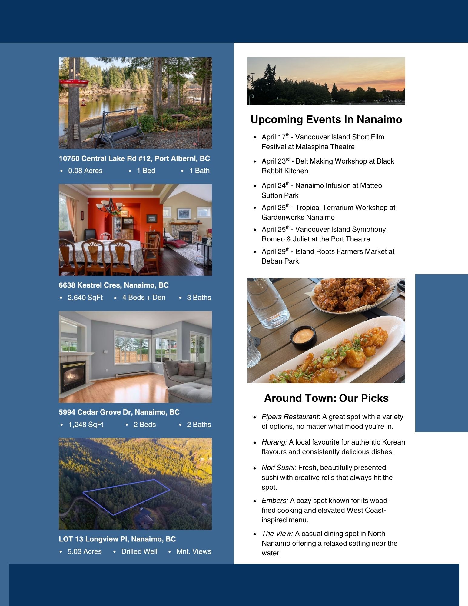 Spring is here, and with it comes fresh activity across the Nanaimo real estate market and Vancouver Island as a whole. In this April 2026 newsletter, we’re sharing a quick market update, our current featured listings, local events happening in Nanaimo, some of our favourite spots around town, and a simple seasonal recipe to enjoy at home.